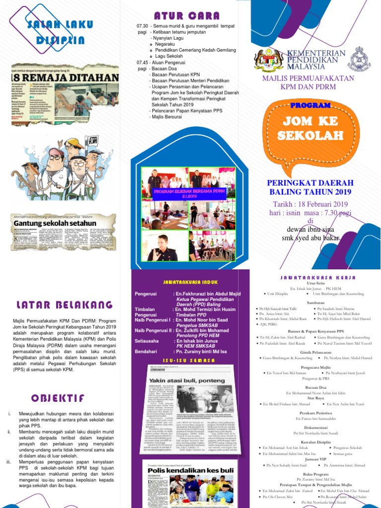 Bentong 17 Februari 2020 Polis Diraja Malaysia PDRM meneruskan kolaborasi dengan Kementerian Pendidikan Malaysia KPM dalam menangani permasalahan disiplin dan salah laku murid melalui program Jom Ke Sekolah Peringkat. Assalamualaikum dan salam sejahtera ini buku program yang pertama kami buat untuk tahun 2017 ni. Berikut kami kongsikan hasil inisiatif Cikgu Hanif Menhad melalui laman blognya hanifmenhadblogspotmy beberapa template brosur dan pamplet berformat Microsoft Publisher untuk jadi sumber rujukan guru-guru lain.